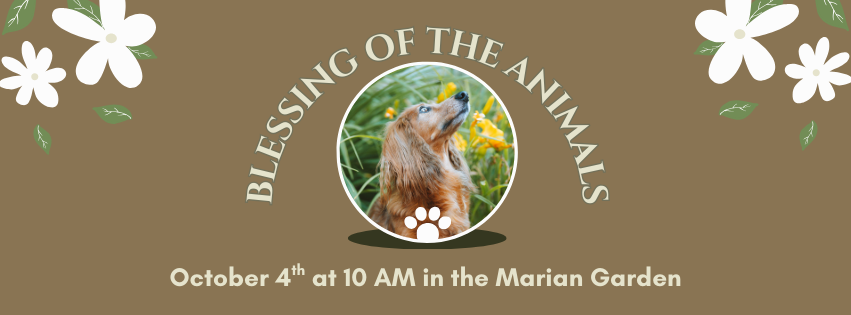 Nuestra Bendición Anual de los Animales está programada para el sábado 4 de octubre a las 10:00 a.m. en la fiesta de San Francisco de Asís, santo patrón de los animales. Se llevará a cabo en nuestro Jardín Mariano junto a la iglesia y Riverside Road. ¡Todas las mascotas son bienvenidas! Traiga a su mascota en una jaula o con correa.