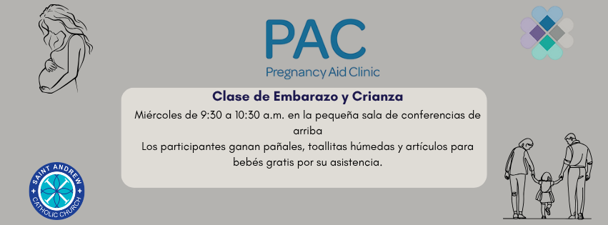 En asociación con la parroquia de St. Andrew, Pregnancy Aid Clinic ofrece clases gratuitas en español sobre el embarazo, la crianza de los hijos y las habilidades para la vida. Las clases cubrirán el embarazo y los primeros dos años de vida e incluirán discusión. Todos son bienvenidos a unirse a nosotros los miércoles de 9:30 a 10:30 a.m. en la pequeña sala de conferencias. Los participantes ganan pañales, toallitas húmedas y artículos para bebés gratis por su asistencia. Los niños lo suficientemente mayores como para sentarse en silencio y entretenerse también pueden unirse. Si tiene preguntas, envíe un correo electrónico a Mary Grace a education@pregnancyaidclinic.org.