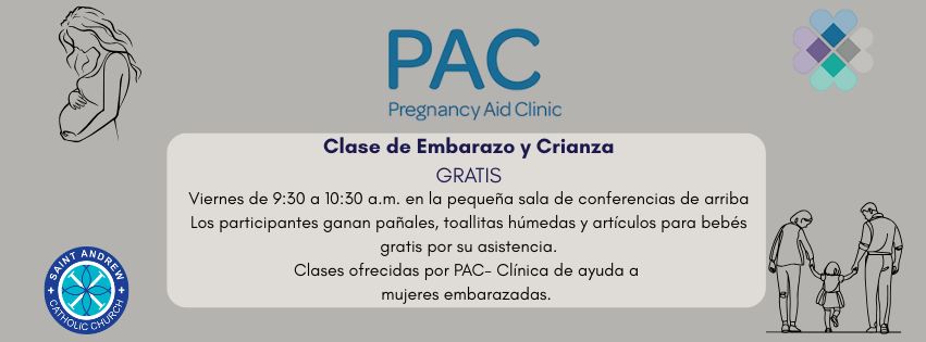 En asociación con la parroquia de St. Andrew, Pregnancy Aid Clinic ofrece clases gratuitas en español sobre el embarazo, la crianza de los hijos y las habilidades para la vida. Las clases cubrirán el embarazo y los primeros dos años de vida e incluirán discusión. Todos son bienvenidos a unirse a nosotros los viernes de 9:30 a 10:30 a.m. en la pequeña sala de conferencias. Los participantes ganan pañales, toallitas húmedas y artículos para bebés gratis por su asistencia. Los niños lo suficientemente mayores como para sentarse en silencio y entretenerse también pueden unirse. Si tiene preguntas, envíe un correo electrónico a Mary Grace a education@pregnancyaidclinic.org.