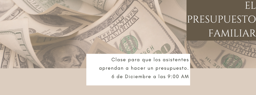 Ofrecemos un taller gratuito sobre Presupuesto Familiar. En este curso breve, le enseñamos los elementos y le ayudamos a diseñar un presupuesto que se adapte a los ingresos de su familia, estilo de vida y prioridades. Esta herramienta básica, le ayudará a fortalecer la economía de su hogar y a tomar decisiones para el futuro. Los esperamos el sábado, 6 de diciembre, de 9AM a 12PM, en el salón del Cenáculo (Upper Room)