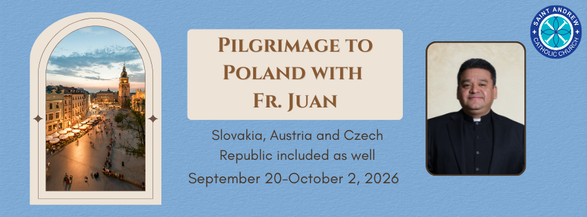Fr. Juan cordially invites you to join him for a 13-day Pilgrimage from September 20, 2026, to October 2, 2026. We will be visiting Poland, Bratislava, Slovakia, Vienna, Austria and Prague in the Czech Republic from Atlanta, GA. Join us!