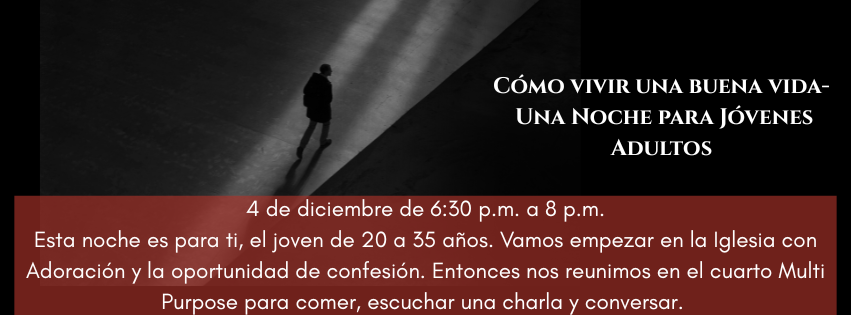Esta noche es para ti, el joven de 20 a 35 años. Vamos empezar en la Iglesia con Adoración y la oportunidad de confesión. Entonces nos reunimos en el cuarto Multi Purpose para comer, escuchar una charla y conversar. El tema de la noche será como vivir una vida buena.