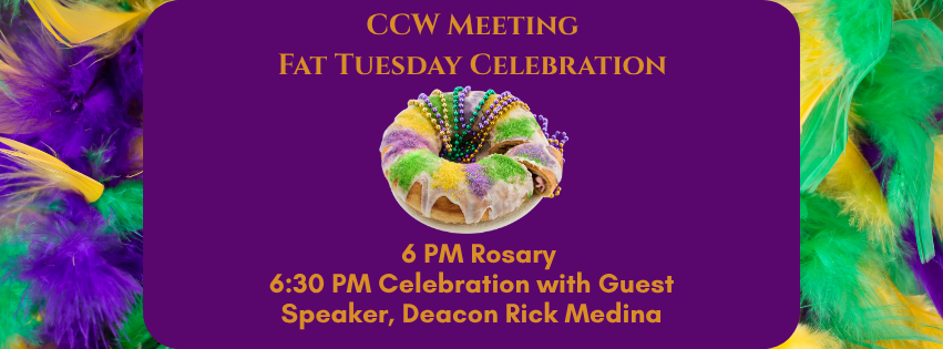 February 17, 2026. - 6p.m. Rosary. 6:30p.m. Fat Tuesday Celebration with food and drink. The guest speaker will be Deacon Rick Medina.