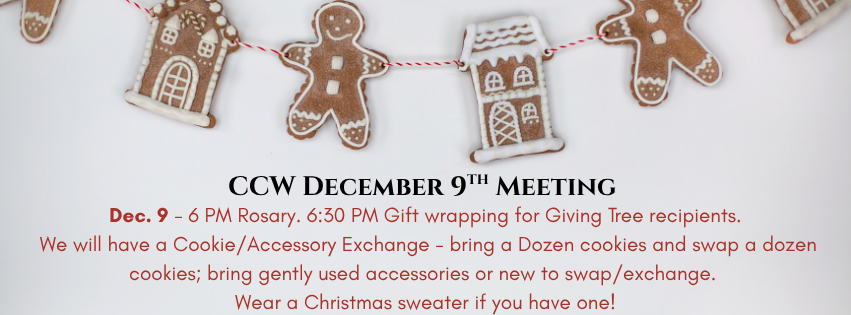 December 9, 2025 - 6p.m. Rosary. 6:30p.m. Gift wrapping for Giving Tree recipients. Will will have a Cookie/Accessory Exchange, Bring a Dozen cookies and Swap a dozen cookies; bring gently used accessories or new to swap/exchange. Suggesting the ladies wear a Christmas sweater.