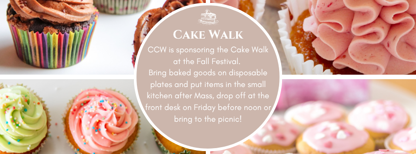 9 de noviembre de 2025 - Fall Festival Cake Walk se considera nuestra reunión. El CCW está haciendo el picnic Cake Walk at the Parish el 9 de noviembre. Lleva pasteles, galletas, brownies y barras en platos desechables. ¡Puede traer los alimentos y ponerlos en la pequeña cocina después de las misas o dejarlos en la recepción el viernes antes del mediodía o llevarlos al picnic!
